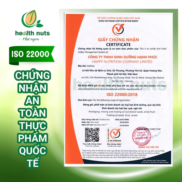 HealthNuts- Hạt ngon: là thương hiệu thực phẩm sạch của công ty TNHH Dinh Dưỡng Hạnh Phúc. Sản phẩm được bày bán trên kệ các siêu thị lớn trên Toàn Quốc. Chứng nhận đạt tiêu chuẩn ISO 22000 ATTP, số CN: ISOQ:2635-FSMS, số công bố chất lượng: 01/HanhPhuc/2022. Giúp bạn an tâm lưạ chọn.
